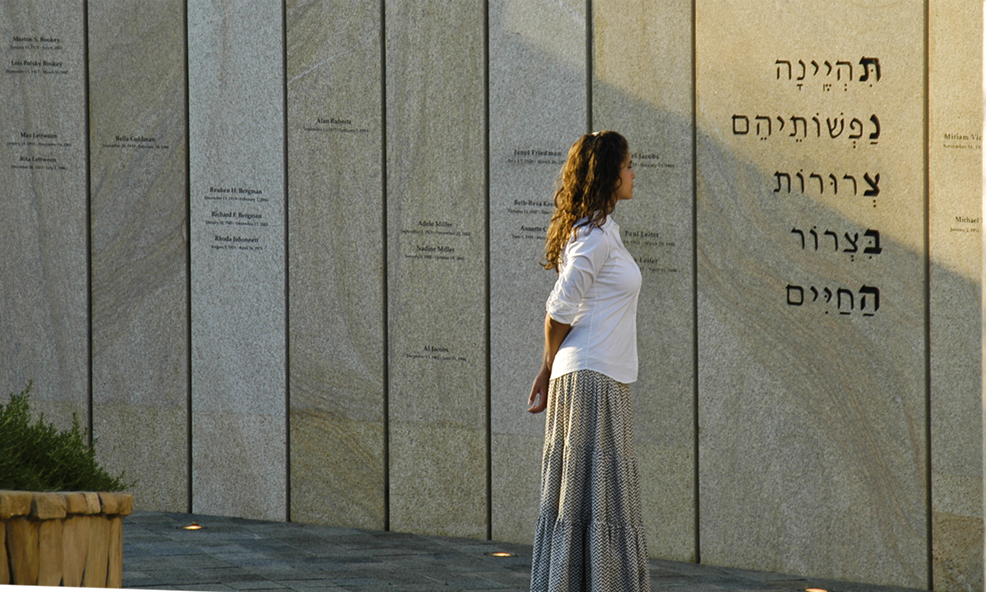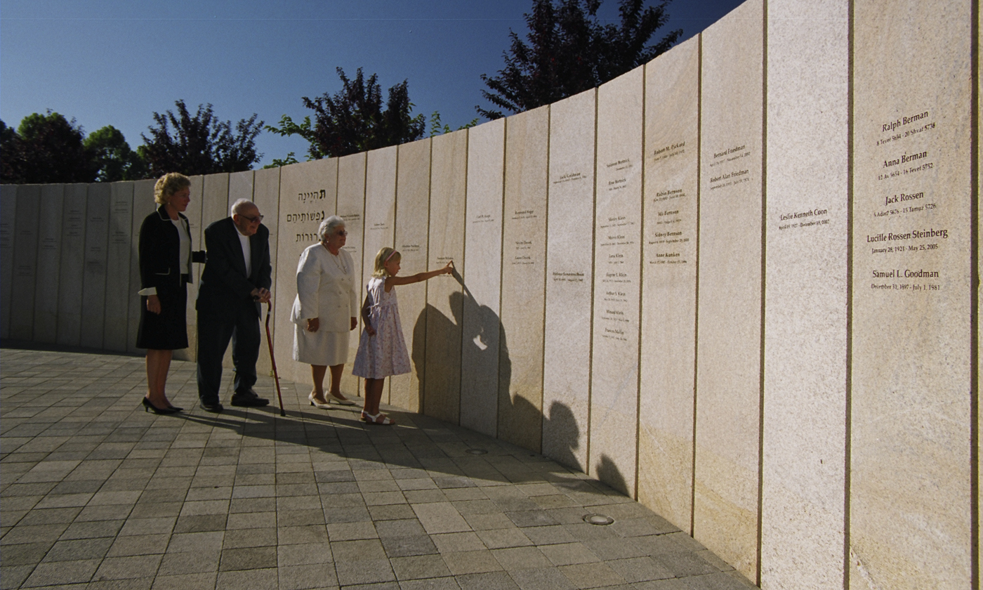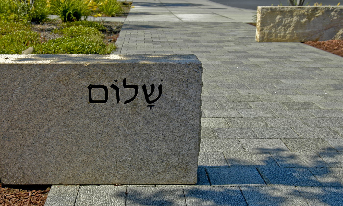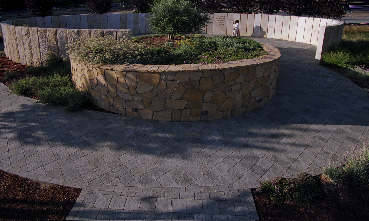 The Congregation Shir Hadash outdoor Memorial project is a serene gathering place for temple congregants and serves as the focal point to remember, honor, and celebrate family, friends, and generations past. Seventy-five vertical granite monoliths, which display prayers and names of loved ones, form an outdoor room made of two interlocking ovals. The ovals have a symbolic quality — they embrace the feeling of family and how we are intertwined in life and also in death. Each wall monolith contains a number of names, and the monoliths are placed so that light can pass through between them. During the day, the light creates bright stripes that move around the memorial so one is always aware that the day is changing. When asked initially what congregants wanted to feel in this space, one member replied, “I want to breathe differently.”