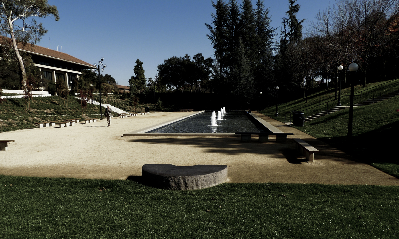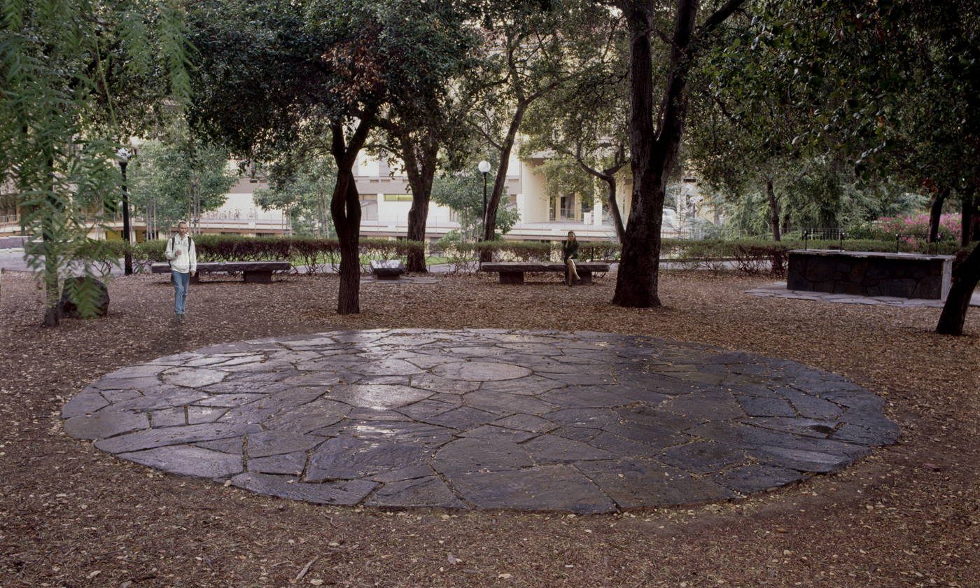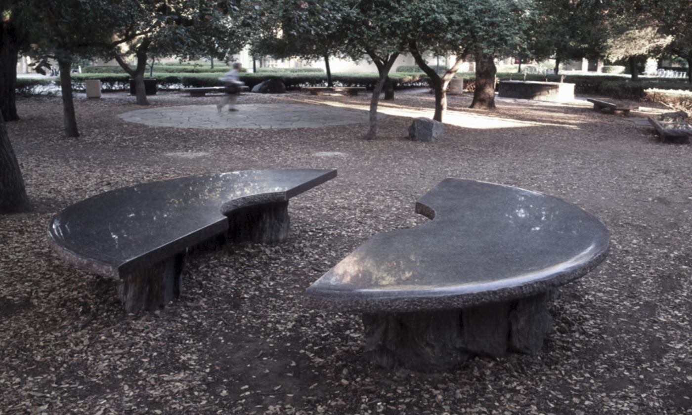 Richard Deutsch was invited to design and create a multiuse environment that visually unifies the two engineering buildings on the site. This environment centers on a dome of basalt, which serves a gathering place in Gibbons Grove. Integrating the grove with the buildings are granite seating areas and a large stone table, all based on the workings of the wheel — a reference to the seminal achievement in the advancement of early engineering technology.